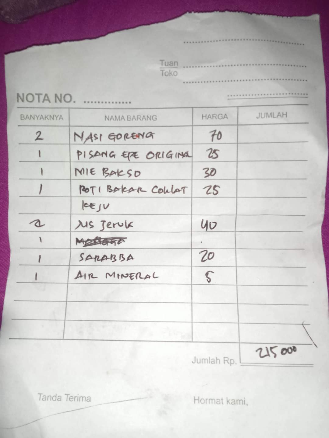 Kemudian mie bakso Rp 30.000, roti bakar cokelat keju Rp 25000, jus jeruk Rp 40.000, sarabba Rp 20.000 dan air mineral Rp 5000 total keseluruhannya Rp 215.000